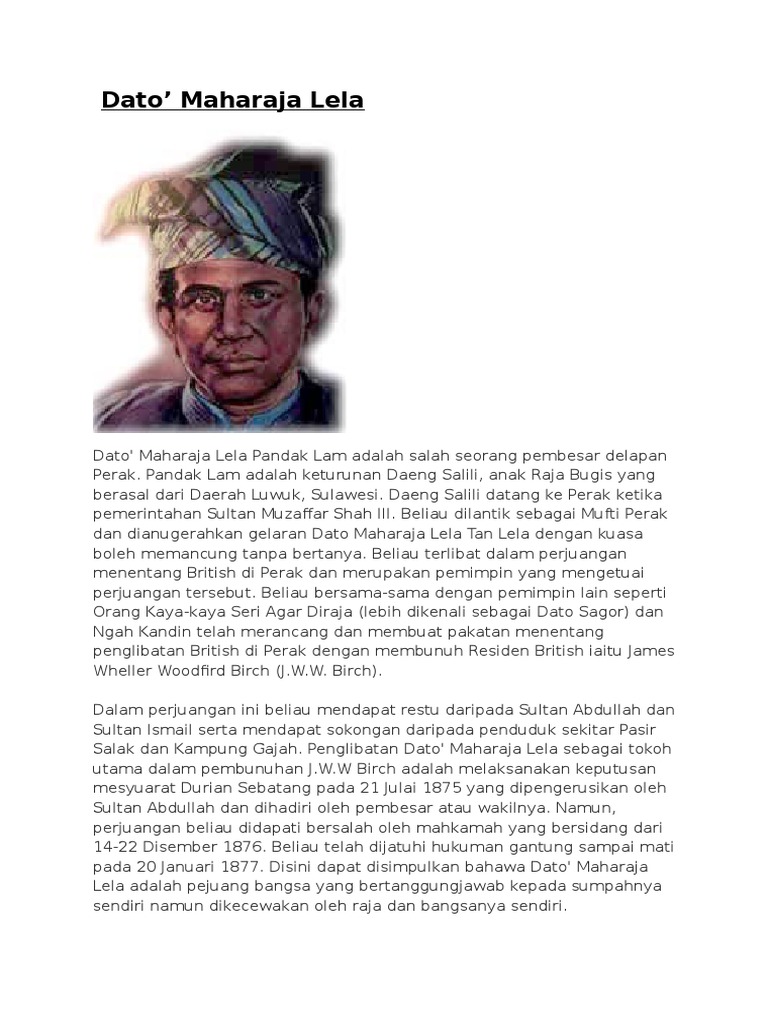 Mon800 am - 500 pm. Up to 24 cash back Sultan Abdullah Dato Maharaja Lela dan Pembesar Melayu telah membuat bantahan terhadap penguasaan British. PENGENALAN DATO MAHARAJA LELA PANDAK LAM Nama.